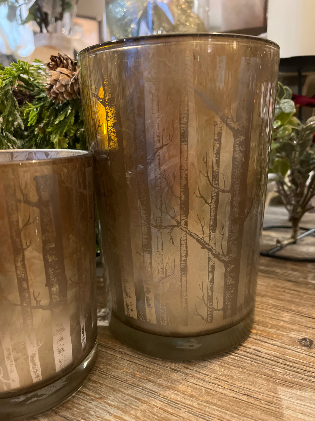 Create a magical festive glow with this frosted glass candle holder, beautifully decorated with a black forest silhouette and Father Christmas flying across the sky in his sleigh with reindeer.