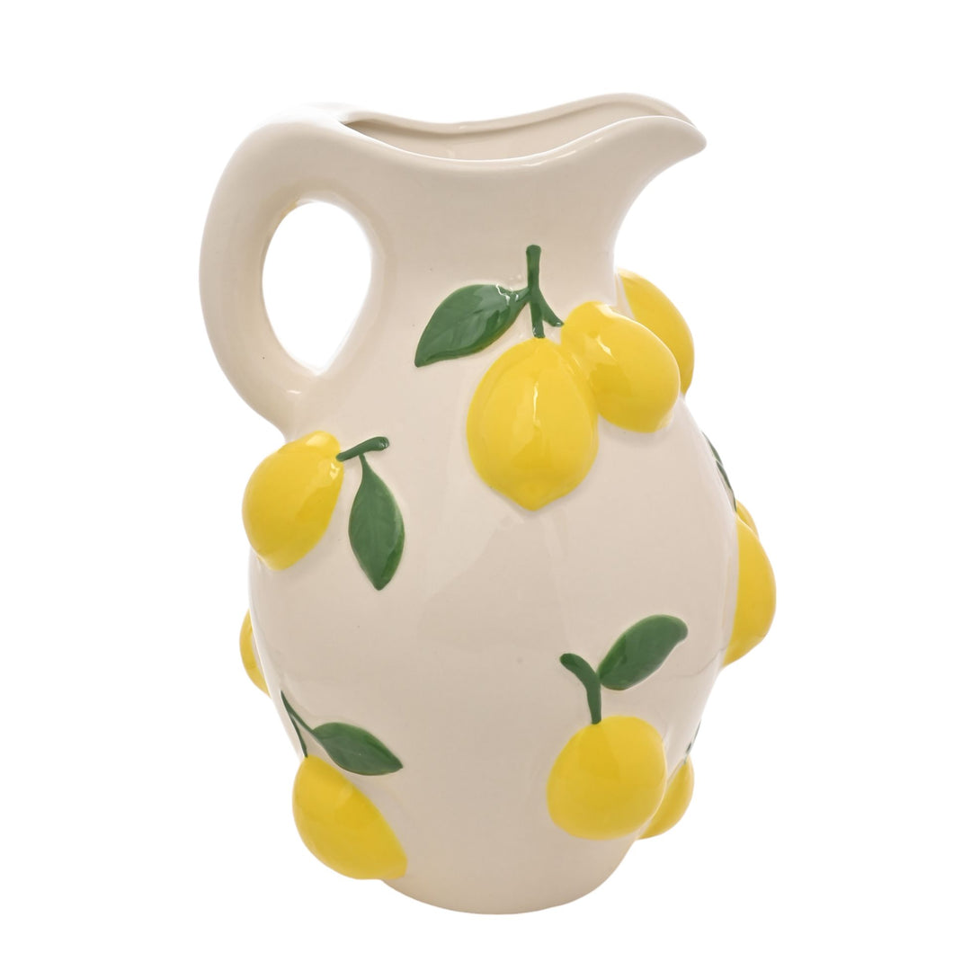 Bring a splash of sunshine to your table with this vibrant Ceramic Lemon Jug, beautifully decorated with 3D sculpted lemons for a realistic and refreshing look. This eye-catching jug is perfect for serving water, juice, or summer cocktails—or simply used as a cheerful vase or kitchen accent piece.